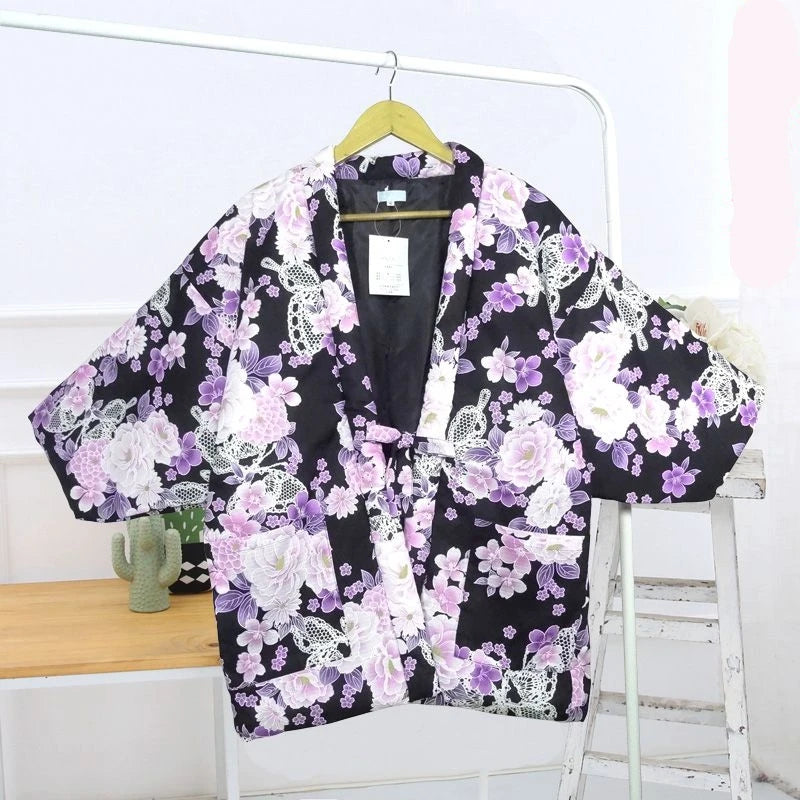 - Type de vêtement : kimono court femme, style haori revisité, manches chauve-souris.