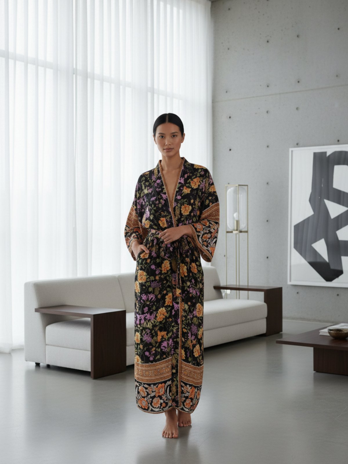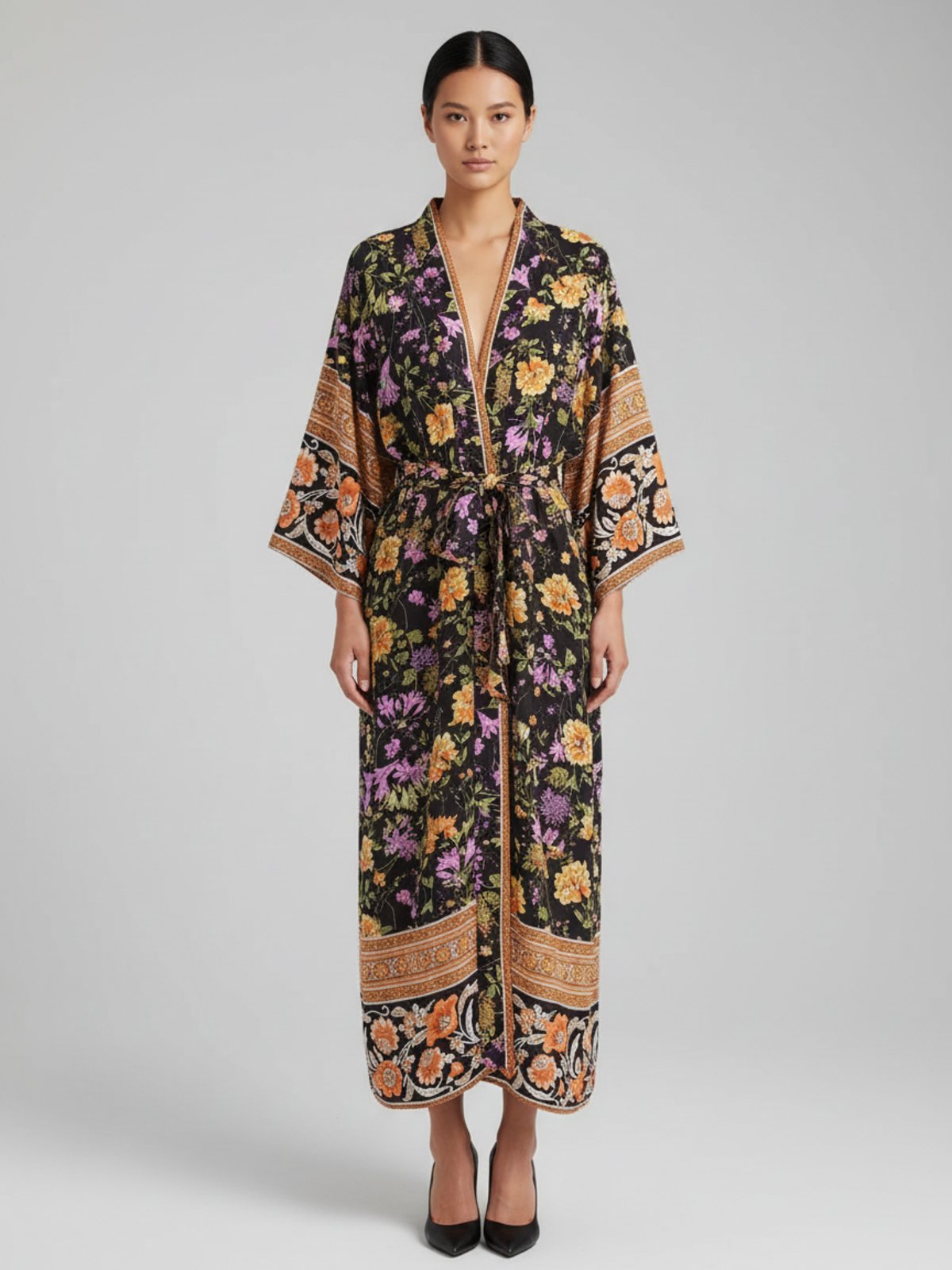 Lavez ce kimono à l'eau froide, cycle délicat ou à la main pour préserver les couleurs et la douceur du tissu. Évitez l'eau chaude et le sèche-linge intense ; préférez un séchage à l'air à plat ou sur cintre à l'ombre. Repassage doux si nécessaire. Pour un look bohème-chic, associez-le à une robe longue fluide et sandales, ou portez-le ouvert sur un top et un jean pour une allure urbaine et sophistiquée..