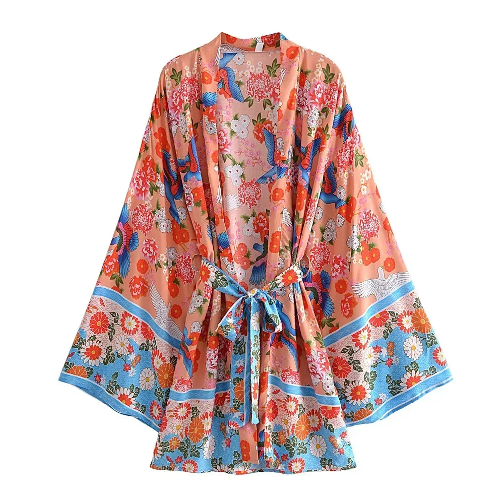 Inspirez-vous de l'esthétique japonaise revisitée avec ce kimono court pour femme, orné d'un motif paon aux accents bohèmes. Sa coupe fluide et ses manches chauve-souris offrent une silhouette sophistiquée tout en garantissant une grande liberté de mouvement — parfait pour apporter une touche artistique à vos tenues sans sacrifier le confort.